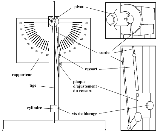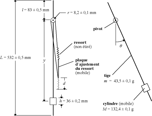 La figure 3 illustre, toujours pour le même montage, un schéma qui n'en présente que les éléments essentiels (la tige, le cylindre, le pivot, le ressort et la plaque d'ajustement), sans se préoccuper du respect intégral de l'échelle et des formes (le ressort est montré beaucoup plus étiré qu'en réalité). L'élimination des éléments non pertinents permet maintenant d'indiquer toutes les quantités, fixes ou variables, mesurées durant l'expérimentation, avec leurs symboles mathématiques et, le cas échéant, leur valeurs.