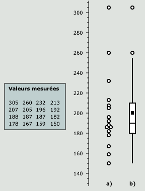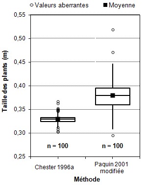 Tout comme l'histogramme, le diagramme à boîte (appelé aussi diagramme à boîte et moustaches, ou encore diagramme de Tukey, du nom de son inventeur) illustre la distribution des valeurs d'une variable. Il fournit une image moins détaillée que l'histogramme, mais permet une meilleure comparaison entre deux distributions (ou plus). Différentes versions du diagramme à boîte ont été proposées : avec ou sans moustaches, avec divers critères pour établir la longueur de celles-ci; avec affichage ou non des valeurs individuelles très éloignées de la moyenne (appelées valeurs aberrantes). La figure 11 illustre celle qui a été retenue pour ce cours. En cliquant dans la figure, une version interactive de celle-ci s'ouvrira dans une nouvelle fenêtre et vous permettra d'obtenir des explications sur les diverses caractéristiques de ce diagramme, fondées sur les notions de moyenne, de médiane (soit le nombre, noté Q2, tel que la moitié des valeurs lui son inférieures et l'autre moitié, supérieures) et de quartiles (les trois nombres, notés Q1, Q2 et Q3, tels que le quart, la moitié et les trois-quarts lui sont inférieurs). Les fonctions calculant ces nombres sont disponibles dans Excel, soit MEDIANE(XX:YY) et QUARTILE(XX:YY;n), où XX:YY désigne la série de valeurs et n vaut 1, 2 ou 3 selon qu'on désire obtenir Q1, Q2 ou Q3. Les fonctions QUARTILE(XX:YY;2) et MEDIANE(XX:YY) fournissent donc le même résultat. Figure 11. Points individuels (a) et diagramme à boîte (b) représentant les valeurs mesurées, affichées dans l'encadré à gauche de l'axe. Cliquez dans la figure ou sur le lien suivant pour ouvrir dans une nouvelle fenêtre une version interactive de la figure décrivant les caractéristiques du diagramme. La boîte proprement dite est associée aux valeurs comprises dans les deux quartiles centraux, soit entre Q1 et Q3; elle comprend donc la moitié des points. Sa hauteur est égale à l'interquartile Q, qui vaut Q3 - Q1. La ligne à l'intérieur de la boîte indique la médiane (ou Q2) et le carré, la moyenne. Les lignes verticales partant des deux extrémités de la boîte, appelées moustaches (whiskers en anglais), indiquent les zones où se retrouvent les valeurs non aberrantes du premier ou du dernier quartile, c'est-à-dire situées à moins de 1,5 Q de la boîte. Dans la version retenue pour ce cours, elles s'arrêtent au dernier point quand celui-ci se trouve à moins de 1,5 Q de la boîte; c'est le cas de la moustache du bas dans la figure 11, qui est par conséquent plus courte que celle du haut. Dans le fichier Excel de gabarits, une option vous permet de choisir entre cette option et celle d'une longueur fixe de 1,5 Q. Cette valeur de 1,5 Q a été fixée de manière arbitraire. Quand la distribution des valeurs est normale, au sens statistique du terme (courbe en forme de cloche), cela signifie que les valeurs aberrantes compteront en moyenne pour un peu moins de 1 % du total. Avec cet outil, nous pouvons comparer de manière plus détaillée deux résultats présentés à la figure 4, soit la taille des plants de variété Mohawk selon deux méthodes de fertilisation. Ainsi, la figure 12, qui combine deux diagrammes à boîte, permet de conclure que si la méthode Paquin 2001 modifiée produit de meilleurs résultats (ce que révélait déjà la figure 4), environ le quart des plants traités avec cette méthode (valeurs situées sous la boîte) ne sont pas vraiment plus grands. Un des plants traités avec cette méthode est même le plus petit de l'ensemble. On remarque également que la méthode Chester 1996a fournit une distribution très « pointue », c'est-à-dire concentrée autour de la médiane (ou de la moyenne), avec plusieurs valeurs aberrantes, alors que l'autre méthode produit une distribution plus étendue.