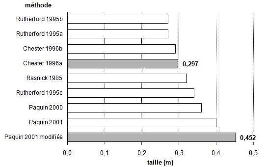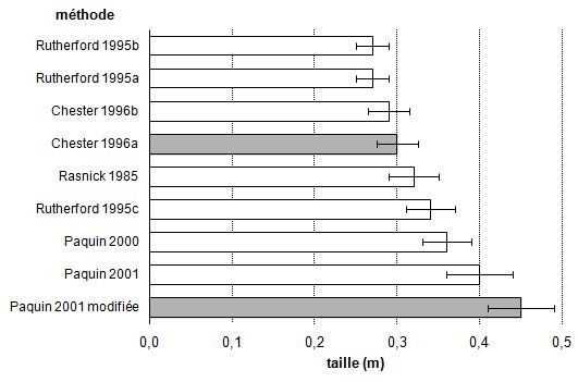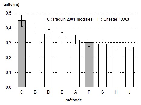 Faites vous-même l'exercice, en comparant la figure ci-dessus et la version où les séries sont regroupées autrement de manière à limiter le nombre de tons de gris (figure 4, dans une nouvelle fenêtre), en vous demandant laquelle est la plus facile à interpréter, ou encore laquelle des deux permet de mieux démontrer que la méthode Paquin 2001 modifiée est supérieure à la méthode Chester 1996a. |