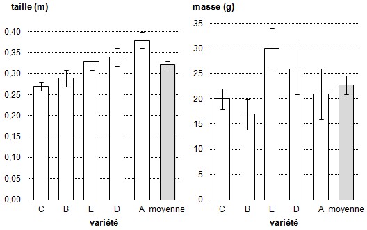 On traite différemment les diagrammes à une et à deux variables dépendantes (donc, avec respectivement deux et une seule variable indépendante). Avec deux variables dépendantes, on place simplement côte-à-côte deux diagrammes, un pour chaque VD. Ainsi, la figure 3 montre un diagramme à barres à 1 VI et 2 VD qui présente, pour cinq variétés de plants (la VI), les différences de croissance selon deux mesures (les VD) : la taille des plants et la masse des feuilles. Remarquez qu'on a employé une teinte différente pour la moyenne, pour bien la distinguer des valeurs individuelles. |