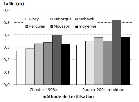 Figure 5. Taille de 5 variétés de plants de 4 mois pour deux méthodes de fertilisation (même données qu'à la figure 4, sans l'incertitude). [Exemple de diagramme à barres à 2 VI et 1 VD, avec 6 tons de gris] |