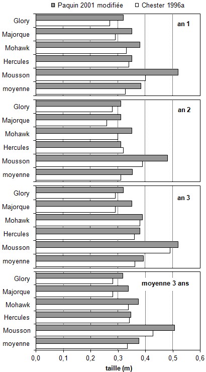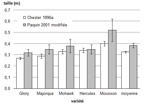 Figure 4. Taille de 5 variétés de plants de 4 mois pour les méthodes de fertilisation décrites dans Chester (1996a) et Paquin (2001), avec modifications. [Exemple de diagramme à barres à 2 VI et 1 VD, avec 2 tons de gris] |