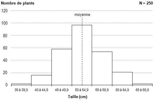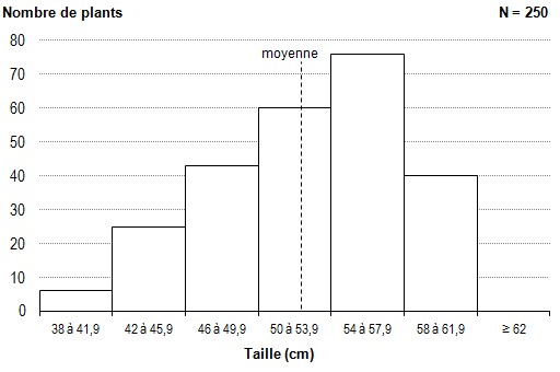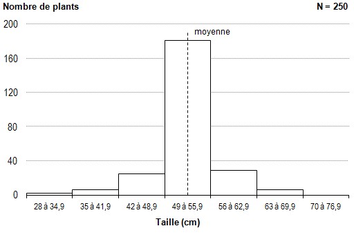 Figure 9. Distribution de la taille de plants de quatre mois de la variété B (N = 250; moyenne = 52,6 cm; écart-type = 5,1 cm). [Exemple d'histogramme illustrant une distribution très concentrée autour de la moyenne] Finalement, l'histogramme de la figure 10 présente une troisième distribution, avec toujours les mêmes moyenne et écart-type. Les tailles, qui varient entre 38 et 62 cm, se répartissent plus largement autour de la moyenne, et de manière asymétrique, de sorte que l'intervalle qui contient le plus de valeurs (environ 29 % du total) n'inclut pas la moyenne. Cette distribution asymétrique se caractérise par une queue à gauche de la moyenne, qui étend l'éventail des valeurs beaucoup plus loin de celle-ci du côté des petites valeurs.