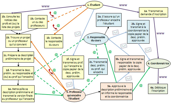 Figure 1. Rôles des personnes concernées par le démarrage du cours et l'inscription. Les flèches colorées désignent des communications s'effectuant, selon le cas, au moyen du fureteur (www), par courriel (@), par téléphone ou par la poste.